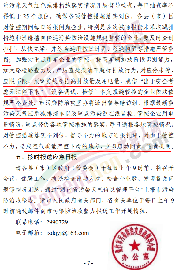 對(duì)管控期間每日通報(bào)問題企業(yè),特別是多次被通報(bào)仍未采取減排措施和涉嫌擅自停運(yùn)污染防治設(shè)施規(guī)避監(jiān)管的企業(yè),要及時(shí)查封扣押,從快立案,并綜合運(yùn)用按日計(jì)罰、移送拘留等措施嚴(yán)管重罰;