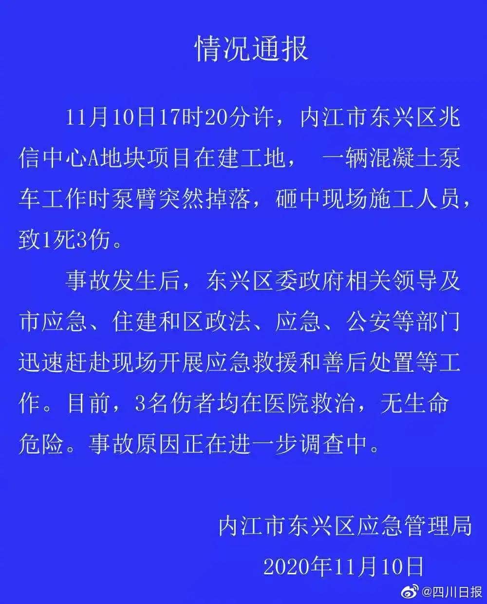 11月10日,有網(wǎng)友爆料稱,內(nèi)江市東興區(qū)兆信中心在建工地發(fā)生事故導(dǎo)致人員傷亡。記者從內(nèi)江市東興區(qū)應(yīng)急管理局處確認(rèn),11月10日17時(shí)20分許,內(nèi)江市東興區(qū)兆信中心A地塊項(xiàng)目在建工地,一輛混凝土泵車工作時(shí)泵臂突然掉落,砸中現(xiàn)場(chǎng)施工人員,致1死3傷。 內(nèi)江市東興區(qū)應(yīng)急管理局11月10日晚間發(fā)布情況通報(bào)稱,事故發(fā)生后,東興區(qū)委政府相關(guān)領(lǐng)導(dǎo)及市應(yīng)急、住建和區(qū)政法、應(yīng)急、公安等部門迅速趕赴現(xiàn)場(chǎng)開(kāi)展應(yīng)急救援和善后處置等工作。目前,3名傷者均在醫(yī)院救治,無(wú)生命危險(xiǎn)。事故原因正在進(jìn)一步調(diào)查中。