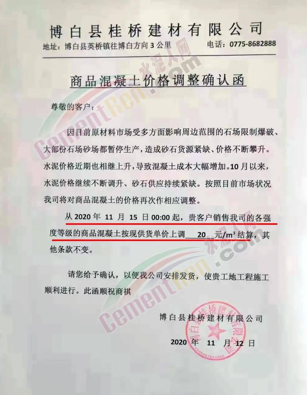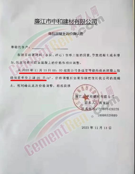 廉江市中和建材有限公司通知,根據(jù)目前原材料(水泥、碎石)價格上漲的因素,導致混凝土成本增加,公司對商品混凝土的價格作相應調(diào)整。從2020年11 月15日0時起我公司各強度等級的商品混凝土按現(xiàn)供貨單價上調(diào) 20 元/立方 。