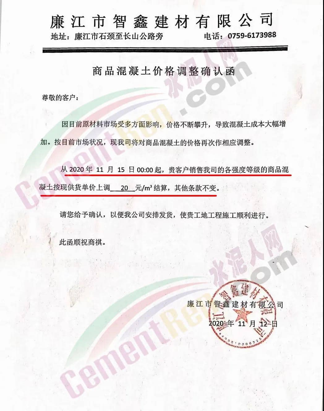廉江市智鑫建材有限公司通知,因目前原材料市場受多方面影響,價格不斷攀升,導致混凝土成本大幅增加。按目前市場狀況,公司對商品混凝土的價格再次作相應調(diào)整。從2020年11月15日0時起,公司各強度等級的商品混凝土按現(xiàn)供貨價格上調(diào)20元/方結(jié)算,其他條款不變。