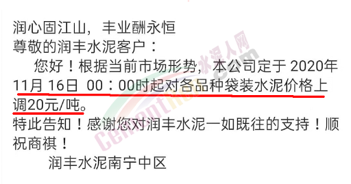 潤豐水泥南寧中區(qū)通知根據(jù)當前市場形勢,公司定于 2020年11月16日 00∶00時起對各品種袋裝水泥價格上調(diào)20元/噸。