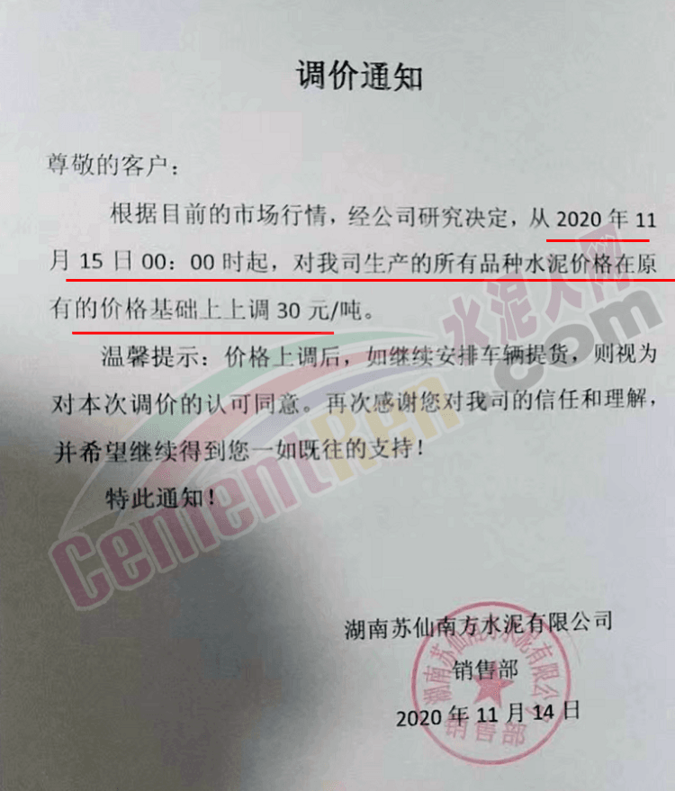 湖南蘇仙南方水泥通知,11月15日0時起上調(diào)30元/噸。