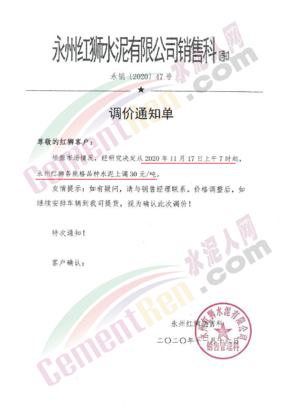 湖南永州紅獅水泥銷售科通知,自11月17日上午7時起,永州紅獅各規(guī)格品種水泥上調(diào)30元/噸。