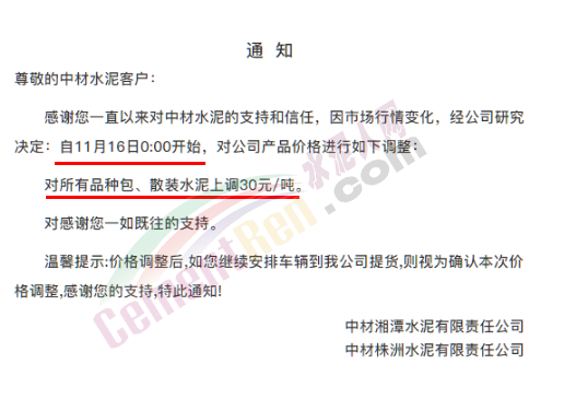 中材湘潭水泥有限責任公司(中材株洲水泥有限責任公司)通知自11月16日0:00開始,對公司所有品種包、散裝水泥上調(diào)30元/噸。