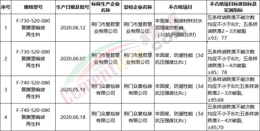 抽查結果顯示,水泥包裝。抽查全省29家企業(yè)生產(chǎn)的60批次水泥包裝袋,檢測發(fā)現(xiàn)4批次產(chǎn)品不合格,不合格發(fā)現(xiàn)率為6.67%。不合格項目為牢固度、防潮性,屬一般不合格。