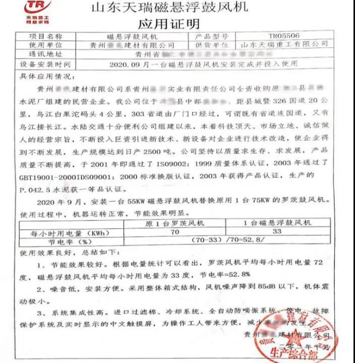山東天瑞重工磁懸浮鼓風(fēng)機(jī)在貴州某水泥廠應(yīng)用為例(參見(jiàn)應(yīng)用證明圖3),經(jīng)天瑞重工技術(shù)人員現(xiàn)場(chǎng)精準(zhǔn)勘測(cè)和技術(shù)論證后,用1臺(tái)55KW天瑞重工磁懸浮鼓風(fēng)機(jī)替換原75KW羅茨風(fēng)機(jī),科學(xué)的安裝調(diào)試后,用電量由原羅茨風(fēng)機(jī)用電量72KW/h,降低至現(xiàn)33KW/h,天瑞重工磁懸浮鼓風(fēng)機(jī)節(jié)電率為52.8%(參見(jiàn)貴州某水泥現(xiàn)場(chǎng)安裝及應(yīng)用證明圖3),節(jié)能效果顯著。