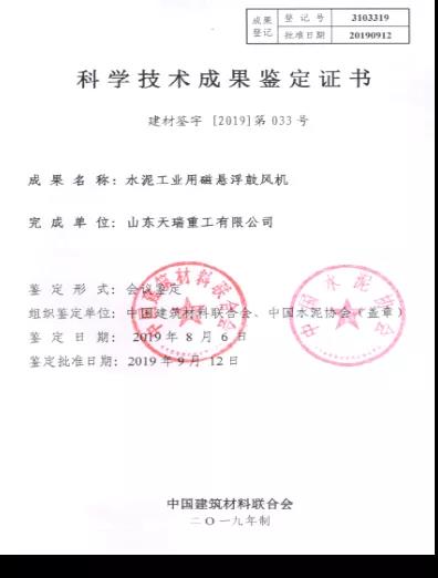 山東天瑞重工磁懸浮鼓風(fēng)機(jī)在節(jié)能降噪方面一直是行業(yè)的標(biāo)桿,2019年8月由中國(guó)建材聯(lián)合會(huì)和中國(guó)水泥協(xié)會(huì)組織召開(kāi)“水泥工業(yè)用磁懸浮風(fēng)機(jī)”科技成果評(píng)價(jià)會(huì)(鑒定證書(shū)參見(jiàn)圖4),評(píng)價(jià)結(jié)論為:天瑞重工磁懸浮項(xiàng)目的成功開(kāi)發(fā)和應(yīng)用,提升了我國(guó)水泥行業(yè)節(jié)能降噪水平,成果總體技術(shù)達(dá)到國(guó)際先進(jìn)水平。