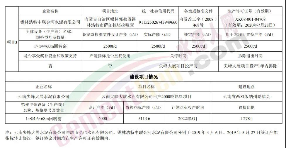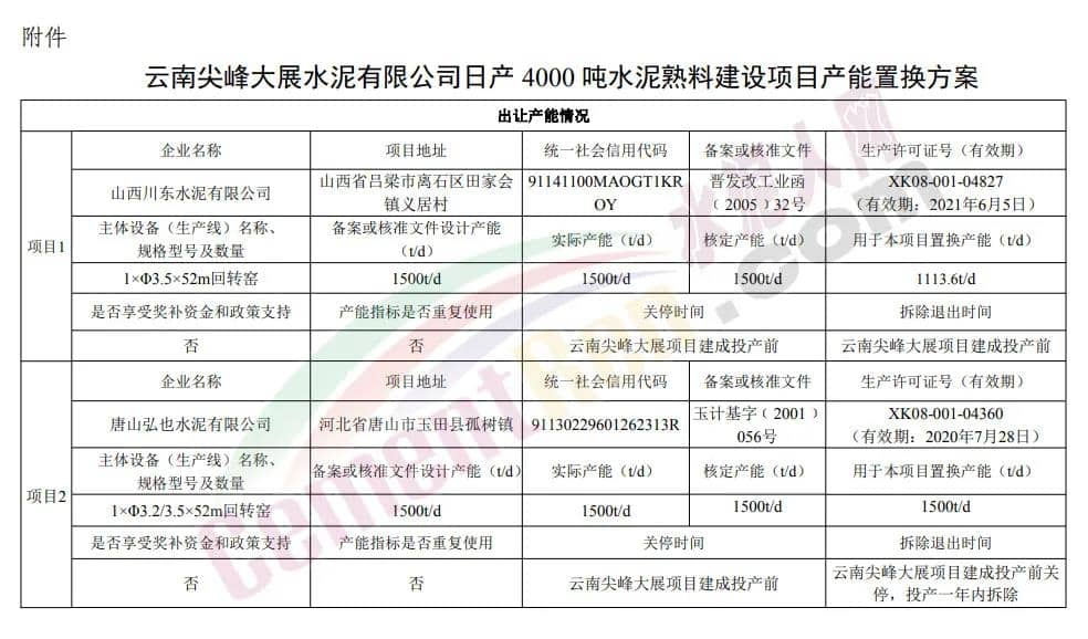 日前,云南工信廳發(fā)布《云南尖峰大展水泥有限公司日產(chǎn)4000噸熟料建設(shè)項目產(chǎn)能置換方案公示》稱,按照相關(guān)文件要求,現(xiàn)將“云南尖峰大展水泥有限公司日產(chǎn)4000噸熟料建設(shè)項目產(chǎn)能置換方案”予以公示。公示期為2020年11月25日至12月8日。如有異議,請于公示期內(nèi)向云南省工業(yè)和信息化廳反映,歡迎社會公眾進行監(jiān)督。公示文件全文如下: