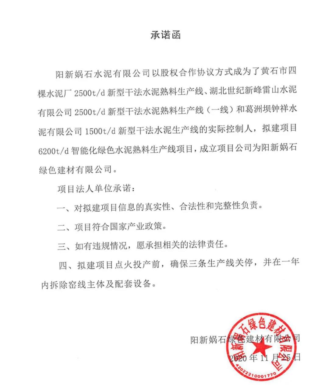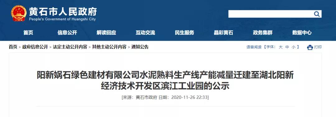日前,黃石市人民政府發(fā)布一則產能置換公示稱,按照相關文件要求為進一步加快水泥產業(yè)結構調整和轉型升級,提升產業(yè)集中度,陽新媧石綠色建材有限公司擬將該企業(yè)實際控制的三條水泥熟料生產線產能減量遷建至湖北陽新經(jīng)濟技術開發(fā)區(qū)濱江工業(yè)園。公示原文如下:
