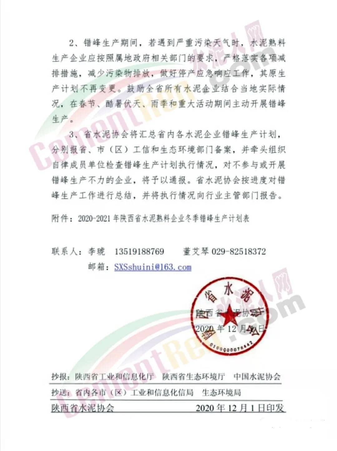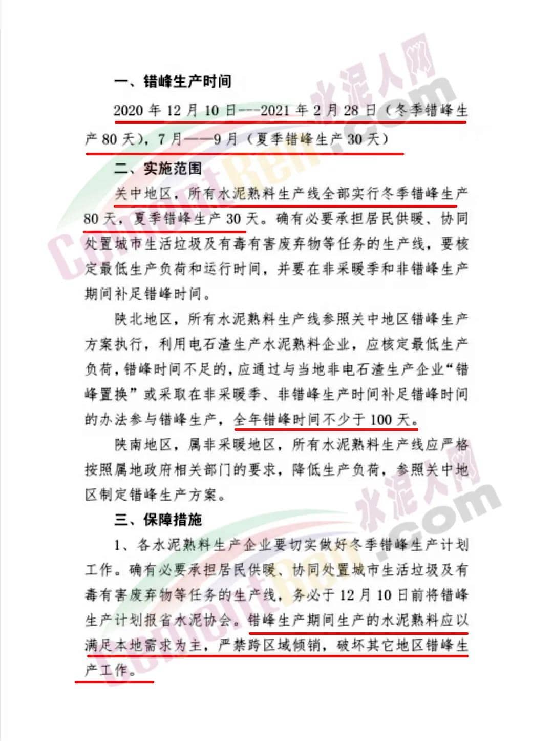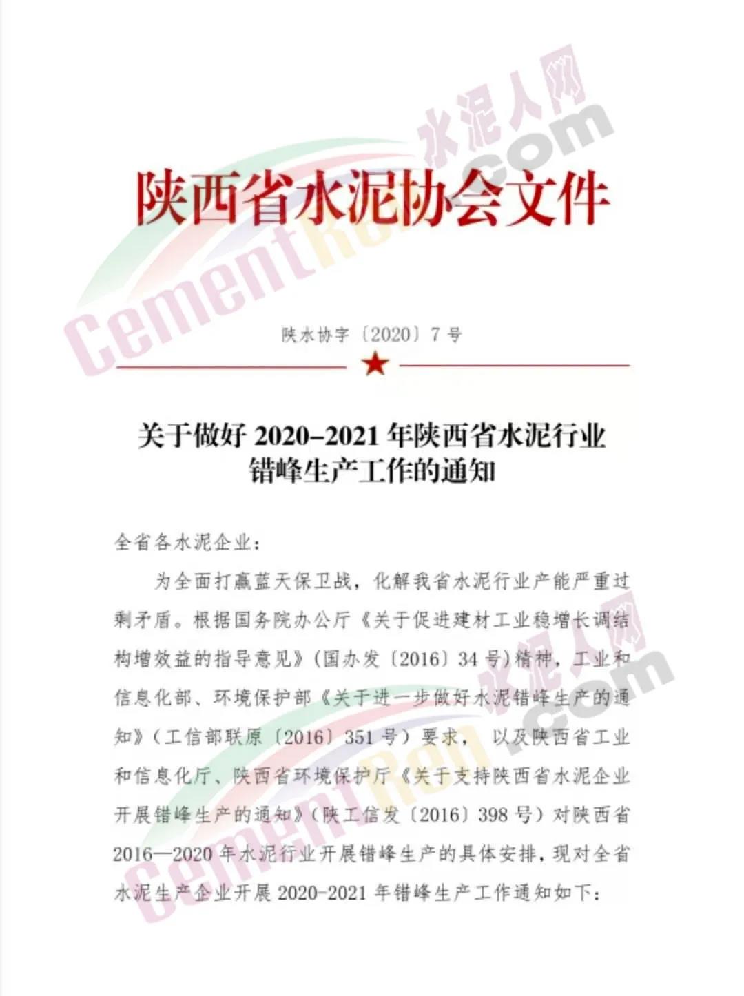 一、錯(cuò)峰生產(chǎn)時(shí)間2020年12月10日—--2021年2月28日(冬季錯(cuò)峰生產(chǎn)80天),7月——9月(夏季錯(cuò)峰生產(chǎn)30天)二、實(shí)施范圍關(guān)中地區(qū),所有水泥熟料生產(chǎn)線全部實(shí)行冬季錯(cuò)峰生產(chǎn)80天,夏季錯(cuò)峰生產(chǎn)30天。確有必要承擔(dān)居民供暖、協(xié)同處置城市生活垃圾及有毒有害廢棄物等任務(wù)的生產(chǎn)線,要核定最低生產(chǎn)負(fù)荷和運(yùn)行時(shí)間,并要在非采暖季和非錯(cuò)峰生產(chǎn)期間補(bǔ)足錯(cuò)峰時(shí)間。陜北地區(qū),所有水泥熟料生產(chǎn)線參照關(guān)中地區(qū)錯(cuò)峰生產(chǎn)方案執(zhí)行,利用電石渣生產(chǎn)水泥熟料企業(yè),應(yīng)核定最低生產(chǎn)負(fù)荷,錯(cuò)峰時(shí)間不足的,應(yīng)通過(guò)與當(dāng)?shù)胤请娛a(chǎn)企業(yè)"錯(cuò)峰置換"或采取在非采暖季、非錯(cuò)峰生產(chǎn)時(shí)間補(bǔ)足錯(cuò)峰時(shí)間的辦法參與錯(cuò)峰生產(chǎn),全年錯(cuò)峰時(shí)間不少于100天。陜南地區(qū),屬非采暖地區(qū),所有水泥熟料生產(chǎn)線應(yīng)嚴(yán)格按照屬地政府相關(guān)部門(mén)的要求,降低生產(chǎn)負(fù)荷,參照關(guān)中地區(qū)制定錯(cuò)峰生產(chǎn)方案。三、保障措施1、各水泥熟料生產(chǎn)企業(yè)要切實(shí)做好冬季錯(cuò)峰生產(chǎn)計(jì)劃工作。確有必要承擔(dān)居民供暖、協(xié)同處置城市生活垃圾及有毒有害廢棄物等任務(wù)的生產(chǎn)線,務(wù)必于12月10日前將錯(cuò)峰生產(chǎn)計(jì)劃報(bào)省水泥協(xié)會(huì)。錯(cuò)峰生產(chǎn)期間生產(chǎn)的水泥熟料應(yīng)以滿足本地需求為主,嚴(yán)禁跨區(qū)域傾銷(xiāo),破壞其它地區(qū)錯(cuò)峰生產(chǎn)工作。2、錯(cuò)峰生產(chǎn)期間,若遇到嚴(yán)重污染天氣時(shí),水泥熟料生產(chǎn)企業(yè)應(yīng)按照屬地政府相關(guān)部門(mén)的要求,嚴(yán)格落實(shí)各項(xiàng)減排措施,減少污染物排放,做好停產(chǎn)應(yīng)急響應(yīng)工作,其原生產(chǎn)計(jì)劃不再變更。鼓勵(lì)全省所有水泥企業(yè)結(jié)合當(dāng)?shù)貙?shí)際情況,在春節(jié)、酷暑伏天、雨季和重大活動(dòng)期間主動(dòng)開(kāi)展錯(cuò)峰生產(chǎn)。3、省水泥協(xié)會(huì)將匯總省內(nèi)各水泥企業(yè)錯(cuò)峰生產(chǎn)計(jì)劃,分別報(bào)省、市(區(qū))工信和生態(tài)環(huán)境部門(mén)備案,并牽頭組織自律成員單位檢查錯(cuò)峰生產(chǎn)計(jì)劃執(zhí)行情況,對(duì)不參與或開(kāi)展錯(cuò)峰生產(chǎn)不力的企業(yè),將予以通報(bào)。省水泥協(xié)會(huì)按進(jìn)度對(duì)錯(cuò)峰生產(chǎn)工作進(jìn)行總結(jié),并將執(zhí)行情況向行業(yè)主管部門(mén)報(bào)告。通知原文如下: