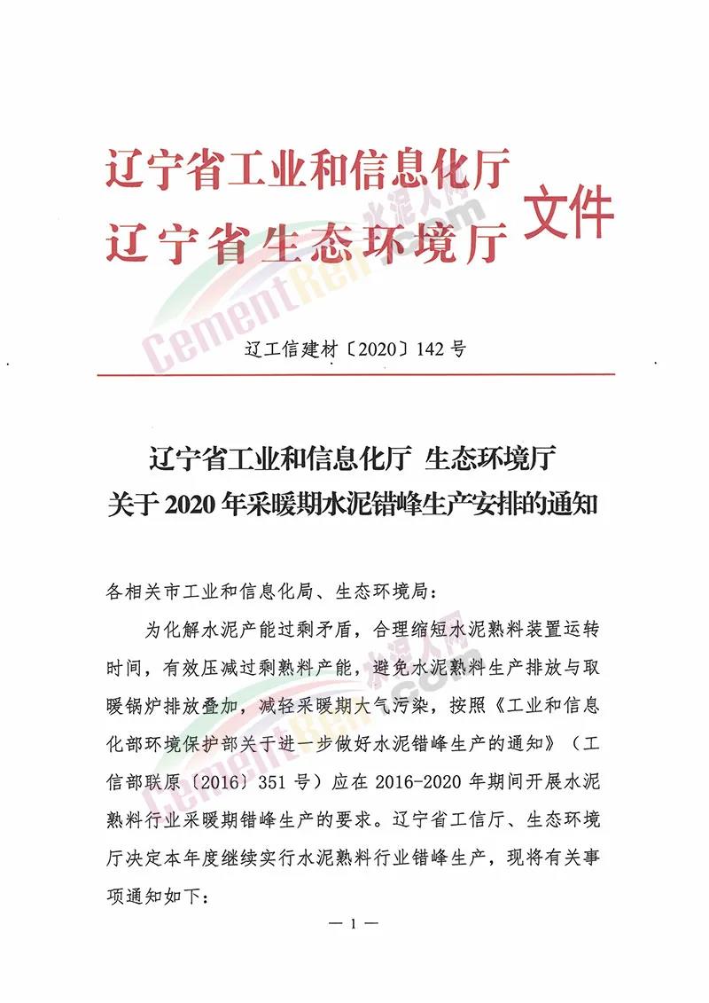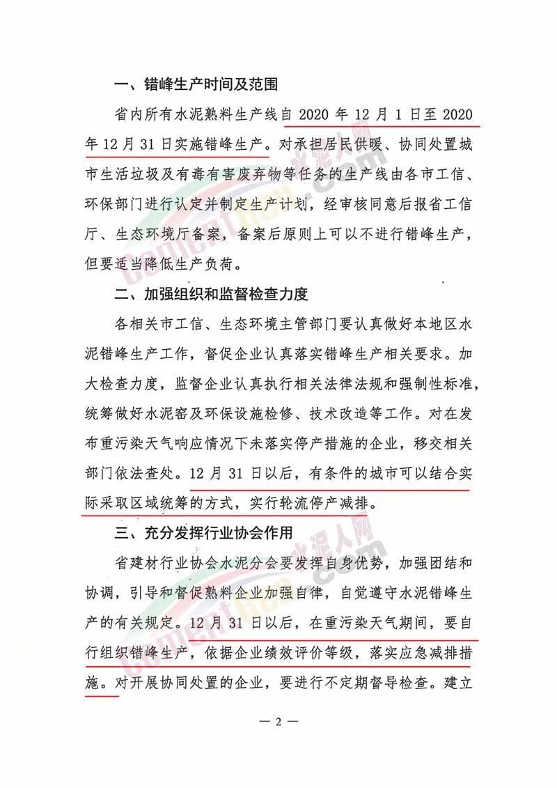 省內(nèi)所有水泥熟料生產(chǎn)線自2020年12月1日至2020年12月31日實施錯峰生產(chǎn)。對承擔(dān)居民供暖、協(xié)同處置城市生活垃圾及有毒有害廢棄物等任務(wù)的生產(chǎn)線由各市工信、環(huán)保部門進(jìn)行認(rèn)定并制定生產(chǎn)計劃,經(jīng)審核同意后報省工信廳、生態(tài)環(huán)境廳備案,備案后原則上可以不進(jìn)行錯峰生產(chǎn),但要適當(dāng)降低生產(chǎn)負(fù)荷。