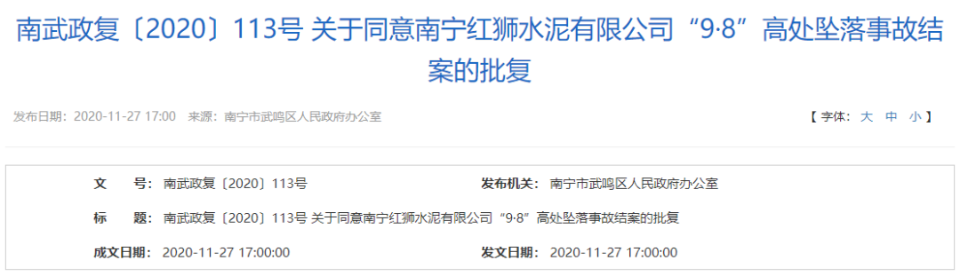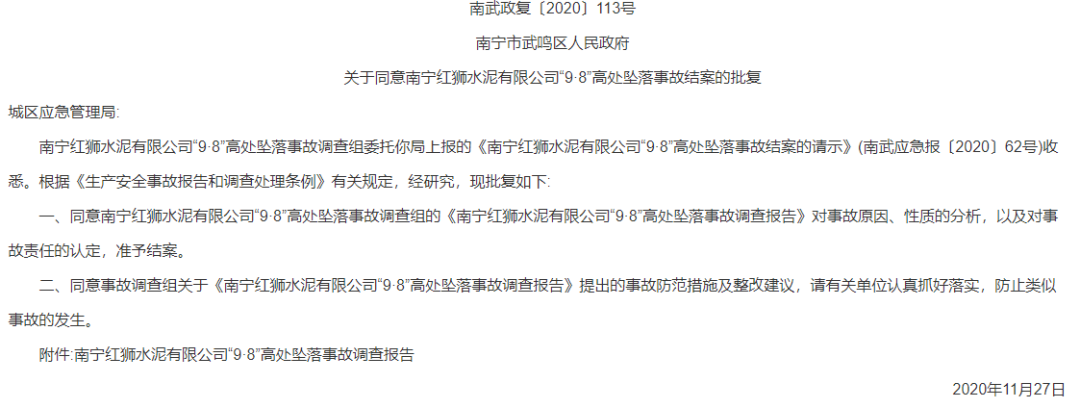 南寧紅獅水泥有限公司“9·8”高處墜落事故調(diào)查報告顯示,2020年9月8日12時48分許,位于南寧市武鳴區(qū)寧武鎮(zhèn)的南寧紅獅水泥有限公司發(fā)生高處墜落事故,導(dǎo)致1人死亡。