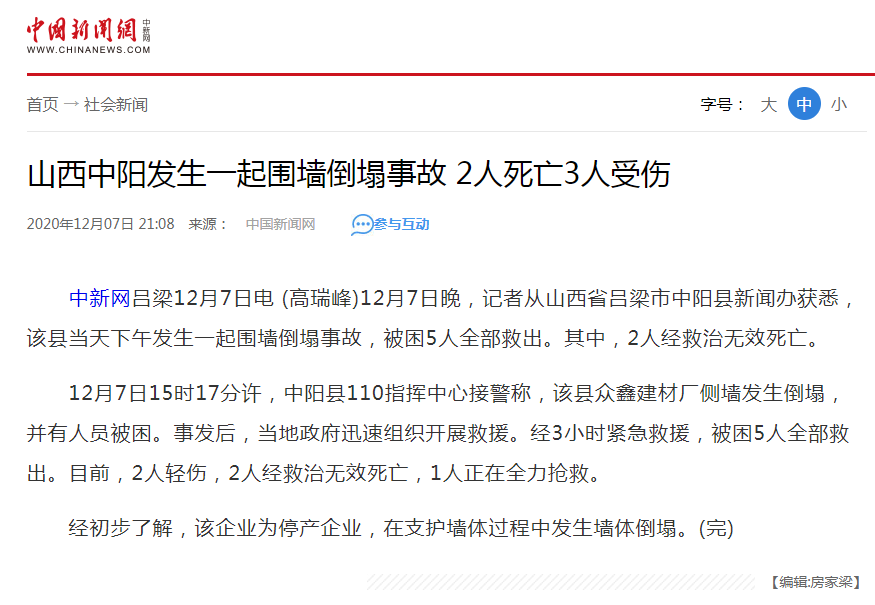 經(jīng)初步了解,該企業(yè)為停產(chǎn)企業(yè),在支護(hù)墻體過(guò)程中發(fā)生墻體倒塌。