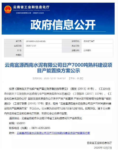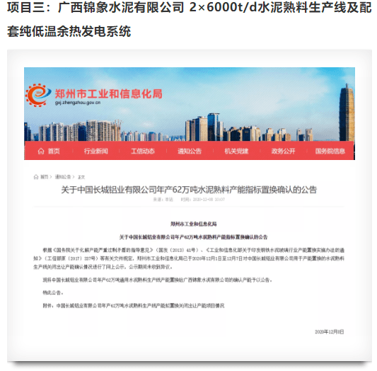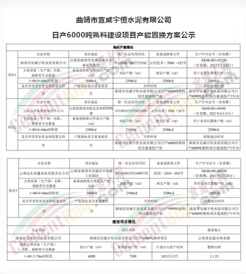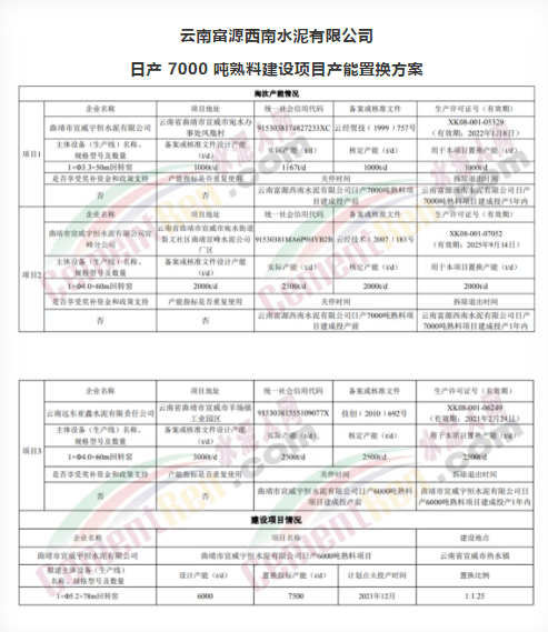 同期,河南省工信廳發(fā)布將湖波水泥年產(chǎn)30萬噸新型干法水泥熟料產(chǎn)能將置換給湖南豪龍環(huán)保建材有限公司用于新建日產(chǎn)8000噸新型干法水泥熟料生產(chǎn)線(240萬噸/年)。鄭州市工信局發(fā)布公告將中國長城鋁業(yè)有限公司年產(chǎn)62萬噸通用水泥熟料生產(chǎn)線產(chǎn)能置換給廣西錦象水泥有限公司,用于在廣西壯族自治區(qū)來賓市象州縣石龍鎮(zhèn)境內(nèi)新建兩條6000t/d(360萬噸/年)水泥熟料生產(chǎn)線,四個項目合計新建產(chǎn)能990萬噸/年。項目一:云南富源西南水泥有限公司日產(chǎn)7000噸熟料建設項目新建生產(chǎn)線位于云南省富源縣工業(yè)園區(qū)勝境片區(qū)設計產(chǎn)能7000t/d(關鍵設備為Φ5.4×72m回轉(zhuǎn)窯一臺)。置換指標產(chǎn)能8751t/d,置換比例1:1.25。計劃點火時間2021年12月。詳情如下: