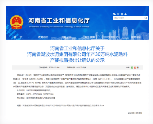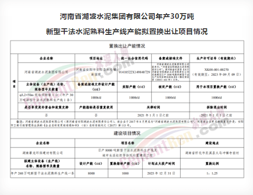 日前,河南省工業(yè)和信息化廳發(fā)布《關于河南省湖波水泥集團有限公司年產(chǎn)30萬噸水泥熟料產(chǎn)能擬置換出讓確認的公示》稱,河南省湖波水泥集團有限公司將年產(chǎn)30萬噸新型干法水泥熟料產(chǎn)能將置換給湖南豪龍環(huán)保建材有限公司用于在湖南省懷化市辰溪縣火馬沖鎮(zhèn)寺前村境內(nèi)新建日產(chǎn)8000噸新型干法水泥熟料生產(chǎn)線及城市生活垃圾等協(xié)同處置建設工程。置換比例為1:1.25,并將于2023年12月31日建成投產(chǎn)。