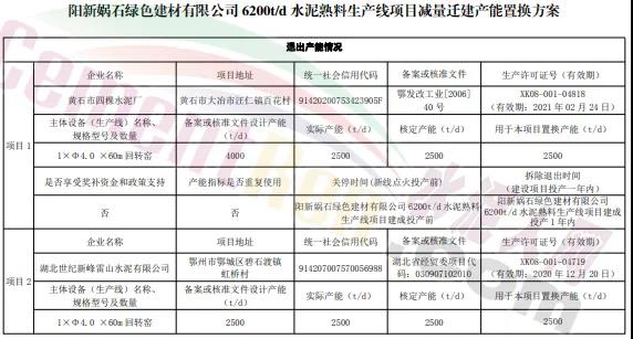 從公示方案可見,陽(yáng)新媧石綠色建材有限公司將在湖北陽(yáng)新經(jīng)濟(jì)技術(shù)開發(fā)區(qū)濱江工業(yè)園內(nèi)新建1條6200t/d水泥熟料生產(chǎn)線(φ5.2m×82m回轉(zhuǎn)窯1條)設(shè)計(jì)產(chǎn)能186萬噸/年,計(jì)劃在2022 年 12 月 31 日點(diǎn)火投產(chǎn)。置換方案如下: