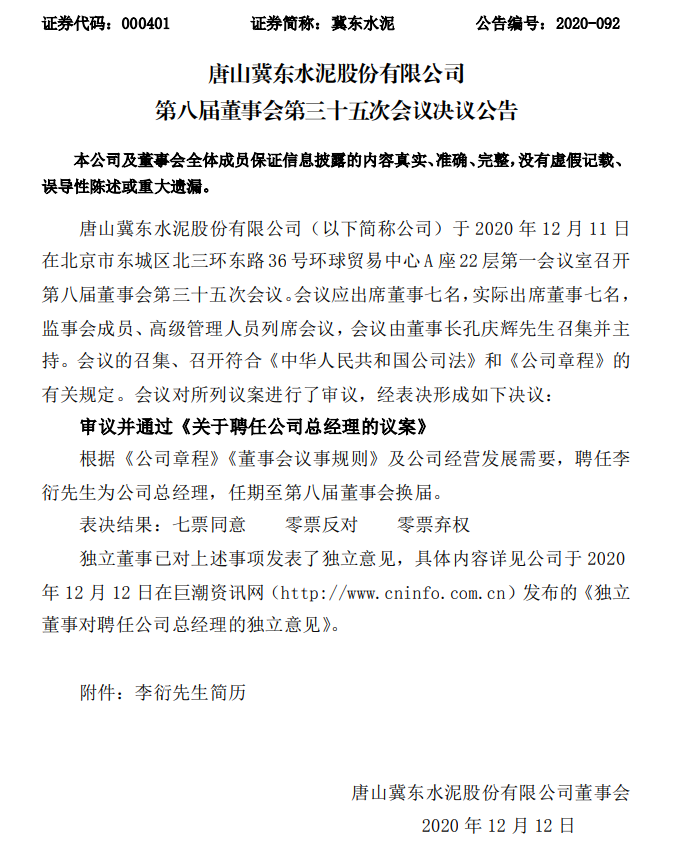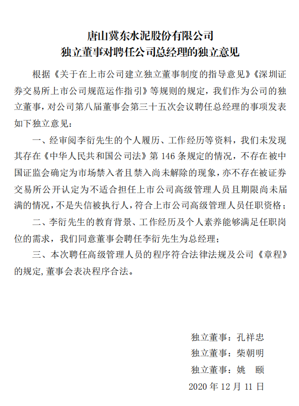 據(jù)水泥人網(wǎng)了解,12月11日,冀東水泥上市公司還曾發(fā)布公告,“唐山冀東水泥股份有限公司獨(dú)立董事對(duì)聘任公司總經(jīng)理的獨(dú)立意見(jiàn)”稱,經(jīng)審閱李衍先生的個(gè)人履歷、工作經(jīng)歷等資料,我們未發(fā)現(xiàn)其存在《中華人民共和國(guó)公司法》第146條規(guī)定的情況,不存在被中國(guó)證監(jiān)會(huì)確定為市場(chǎng)禁入者且禁入尚未解除的現(xiàn)象,亦不存在被證券交易所公開(kāi)認(rèn)定為不適合擔(dān)任上市公司高級(jí)管理人員且期限尚未屆滿的情況,不是失信被執(zhí)行人,符合上市公司高級(jí)管理人員任職資格;李衍先生的教育背景、工作經(jīng)歷及個(gè)人素養(yǎng)能夠滿足任職崗位的需求,同意董事會(huì)聘任李衍先生為總經(jīng)理。