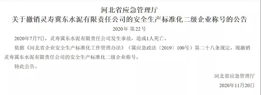據(jù)悉,上述三家企業(yè)均在2019年發(fā)生安全生產(chǎn)亡人事故:8月10日,利比玻璃制品(中國)有限公司發(fā)生高處墜落事故,造成1人死亡;10月24日,河北興華鋼鐵有限公司燒結(jié)球團發(fā)生火災(zāi)事故,造成7人死亡;10月31日,保定天威保變電氣股份有限公司發(fā)生起重傷害事故,造成1人死亡。依據(jù)《河北省企業(yè)安全生產(chǎn)標準化工作管理辦法》,上述三家企業(yè)均不再具備二級企業(yè)安全生產(chǎn)標準化條件。