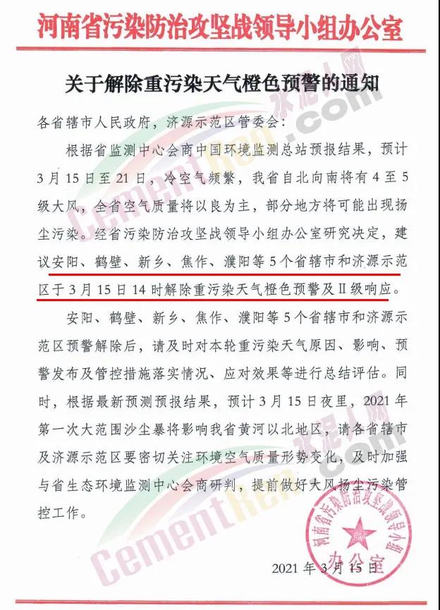 日前,河南省、河北省以及天津市等陸續(xù)發(fā)布解除重污染天氣橙色預(yù)警的通知。解除通知后工地可以正常復(fù)工、水泥企業(yè)也可以恢復(fù)生產(chǎn)。