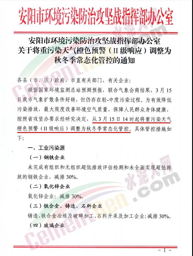 安陽(yáng)市環(huán)境污染防治攻堅(jiān)戰(zhàn)指揮部辦公室發(fā)布《關(guān)于將重污染天氣橙色預(yù)警(II級(jí)響應(yīng))調(diào)整為秋冬季常態(tài)化管控的通知》稱,按照河南省攻堅(jiān)辦要求經(jīng)研究決定,從3月15日14時(shí)起將重污染天氣 橙色預(yù)警(II級(jí)響應(yīng))調(diào)整為秋冬季常態(tài)化管控。