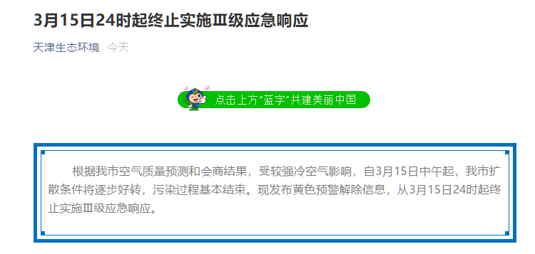 同一天,天津市發(fā)通知從3月15日24時(shí)起終止實(shí)施Ⅲ級(jí)應(yīng)急響應(yīng)。