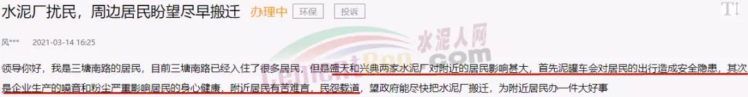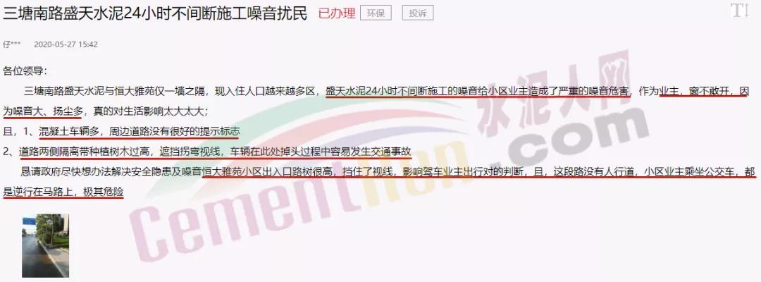 據(jù)水泥人網(wǎng)了解,上述兩家企業(yè)一家為水泥制品工廠,一家為商品混凝生產(chǎn)企業(yè)。且早在2020年5月27日,就有網(wǎng)友在人民網(wǎng)地方留言板給興寧區(qū)委書記留言稱,三塘南路盛天水泥24小時不間斷施工,噪音大、揚(yáng)塵多,業(yè)主不敢開窗。而且,混凝土車輛多,周邊道路沒有很好的提示標(biāo)志 ,道路兩側(cè)隔離帶種植樹木遮擋拐彎視線,車輛在此處極容易發(fā)生交通事故。