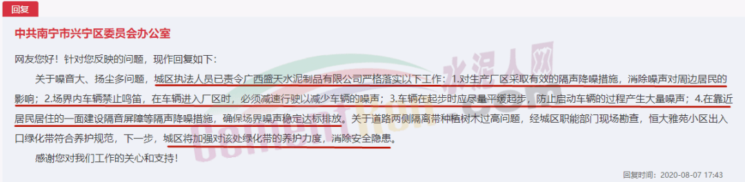 中共南寧市興寧區(qū)委員會辦公室于2020年8月7日回復(fù)稱城區(qū)執(zhí)法人員已責(zé)令廣西盛天水泥制品有限公司采取相關(guān)措施整治噪音和揚(yáng)塵問題。關(guān)于道路兩側(cè)隔離帶種植樹木過高問題,城區(qū)將加強(qiáng)對該處綠化帶的養(yǎng)護(hù)力度,消除安全隱患。