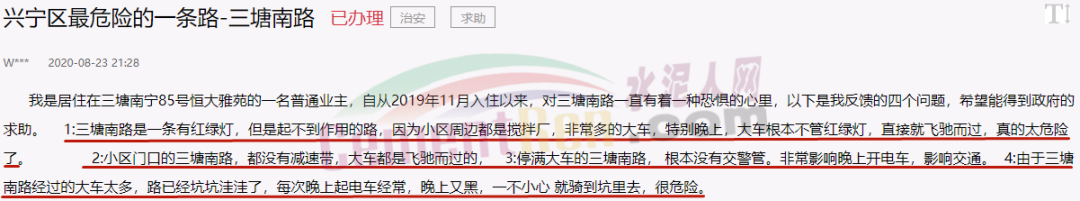 但是,2020年8月23日,又有網(wǎng)友在人民網(wǎng)地方留言板留言稱,三塘南路是興寧區(qū)最危險(xiǎn)的一條路,紅綠燈起不到作用,沒有減速帶,沒有交警管,周邊攪拌廠的大車都是直接就飛馳而過,非常危險(xiǎn)。而且由于三塘南路經(jīng)過的大車太多,路坑坑洼洼,晚上又黑,一不小心就騎到坑里去,很危險(xiǎn)。