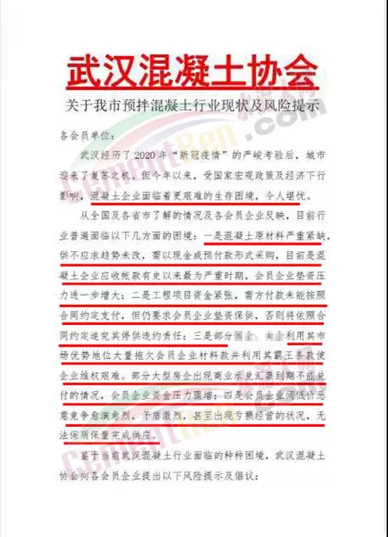 鑒于當(dāng)前武漢混凝土行業(yè)面臨的種種困境,武漢混凝土協(xié)會向各會員企業(yè)提出以下風(fēng)險提示及倡議∶