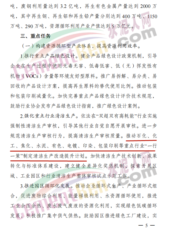 日前,發(fā)改委發(fā)布《關(guān)于印發(fā)“十四五”循環(huán)經(jīng)濟(jì)發(fā)展規(guī)劃的通知》,《通知》提到,將推動石化、化工、焦化、水泥、有色、電鍍、印染、包裝印刷等重點行業(yè)“一行一策”制定清潔生產(chǎn)改造提升計劃。