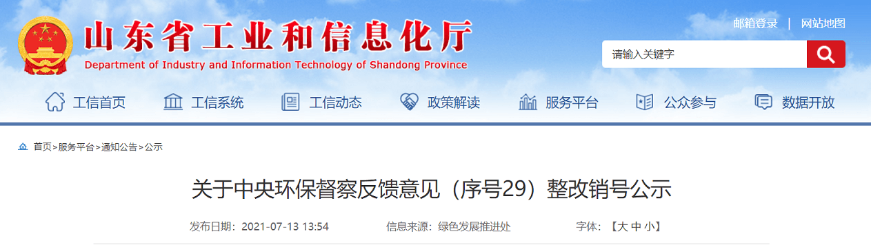 根據(jù)中央環(huán)保督察要求,中央環(huán)保督察反饋意見中第29項(xiàng)由山東省工業(yè)和信息化廳負(fù)責(zé)的整改內(nèi)容已完成整改,現(xiàn)進(jìn)行銷號公示,公示時間2021年7月13日至19日(共5個工作日)。