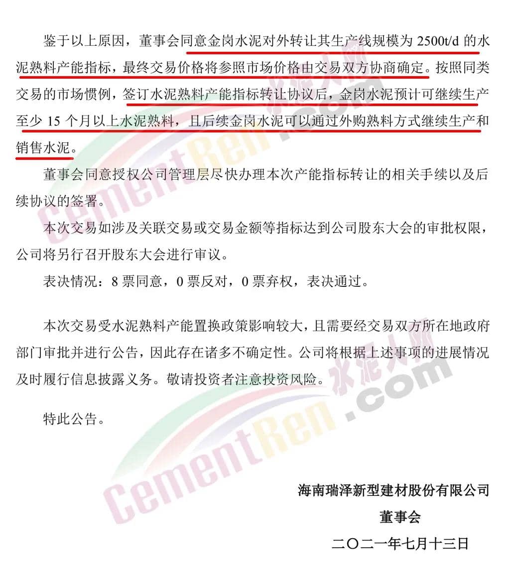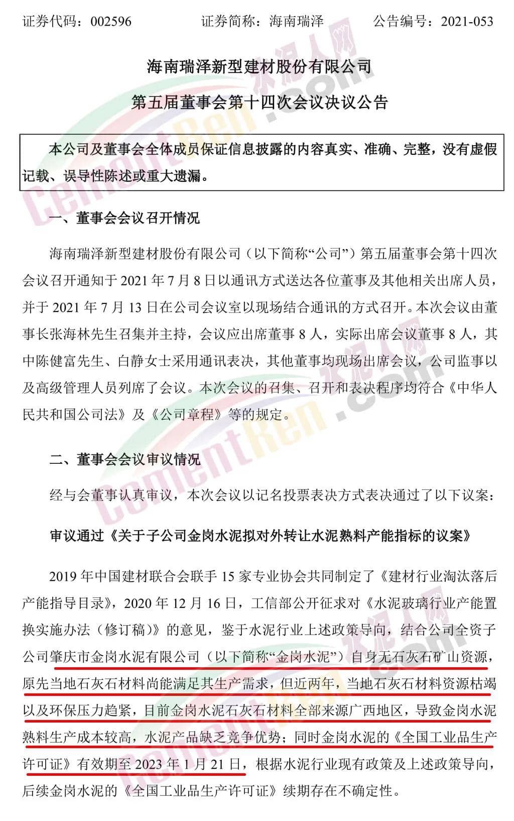 海南瑞澤新型建材股份有限公司上市公司發(fā)布第五屆董事會(huì)第十四次會(huì)議決議公告提到,鑒于水泥行業(yè)政策導(dǎo)向,結(jié)合公司全資子公司肇慶市金崗水泥有限公司(以下簡(jiǎn)稱“金崗水泥”)自身無(wú)石灰石礦山資源,原先當(dāng)?shù)厥沂牧仙心軡M足其生產(chǎn)需求,但近兩年,當(dāng)?shù)厥沂牧腺Y源枯竭以及環(huán)保壓力趨緊,目前金崗水泥石灰石材料全部來(lái)源廣西地區(qū),導(dǎo)致金崗水泥熟料生產(chǎn)成本較高,水泥產(chǎn)品缺乏競(jìng)爭(zhēng)優(yōu)勢(shì);