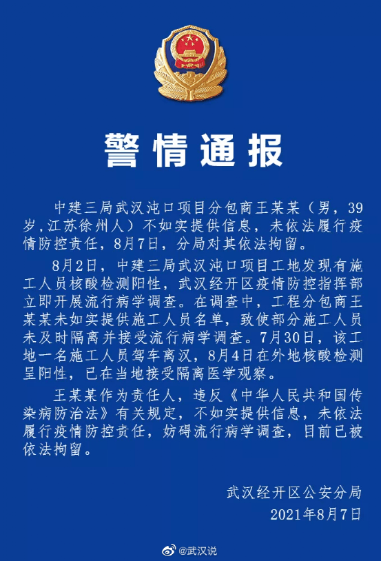 8月7日,武漢經(jīng)開區(qū)公安分局發(fā)布警情通報(bào):中建三局武漢沌口項(xiàng)目分包商王某某(男,39歲,江蘇徐州人)不如實(shí)提供信息,未依法履行疫情防控責(zé)任,8月7日,分局對(duì)其依法拘留。