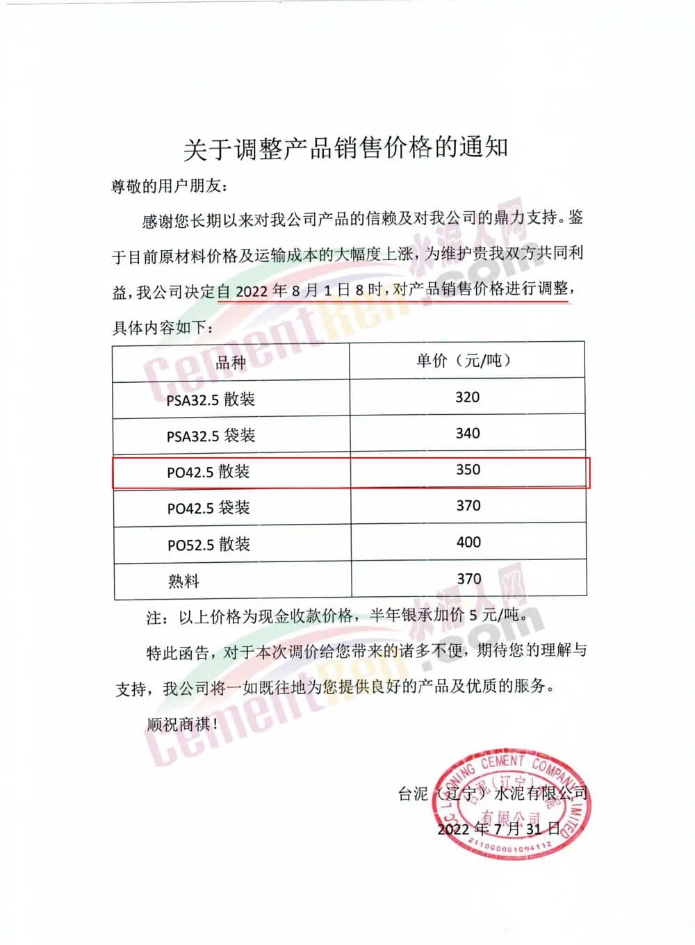 臺(tái)泥(遼寧)水泥有限公司通知稱,自8月1日8時(shí)起對(duì)產(chǎn)品銷售價(jià)格進(jìn)行調(diào)整,調(diào)整后P.O42.5散裝水泥報(bào)價(jià)350元/噸。