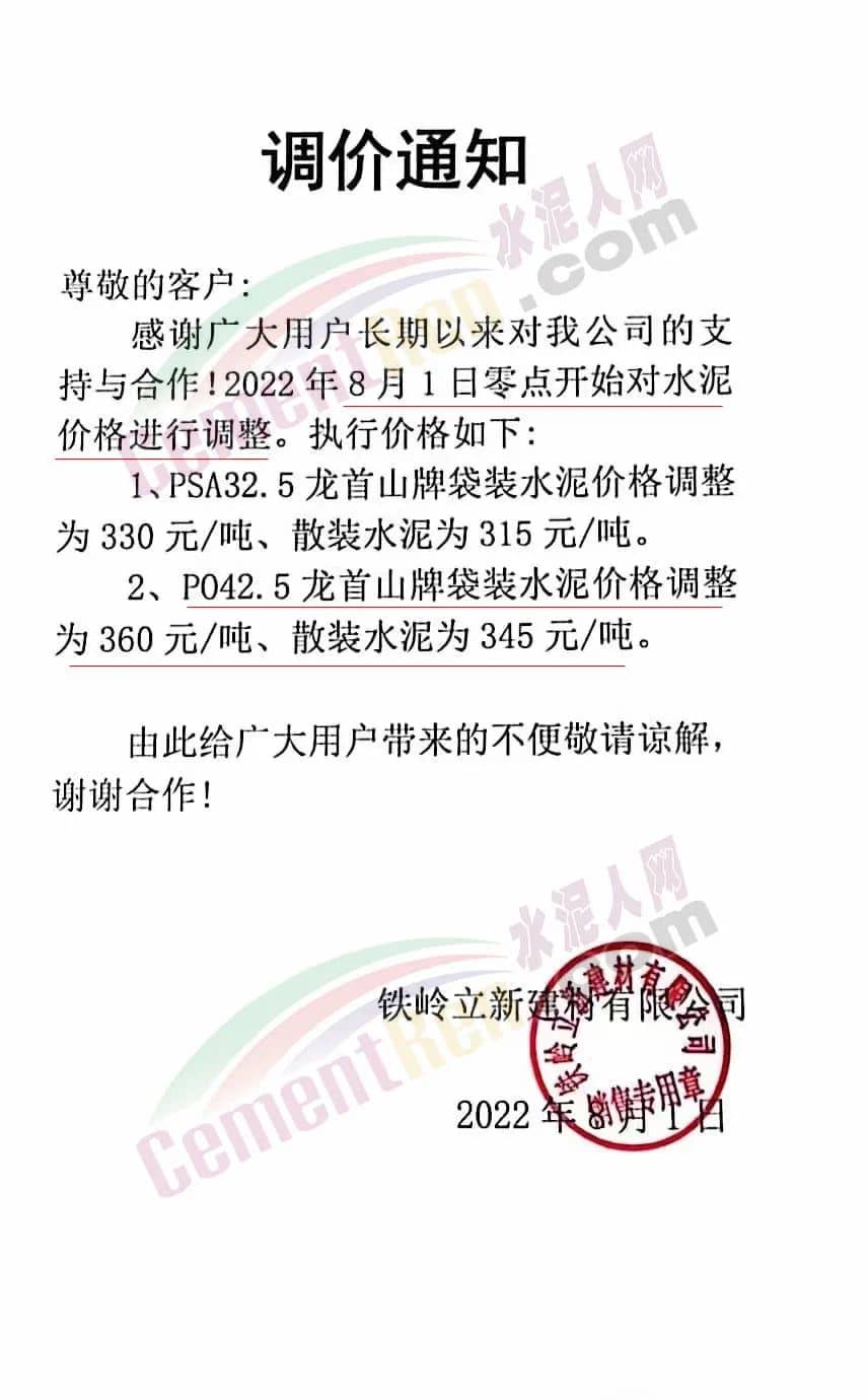 鐵嶺立新建材有限公司通知自8月1日零點(diǎn)開(kāi)始對(duì)水泥價(jià)格進(jìn)行調(diào)整,調(diào)整后PSA32.5A龍首山袋裝水泥為330元/噸,散裝水泥為315元/噸。P.O42.5龍首山牌袋裝水泥為360元/噸,散裝水泥為345元/噸。