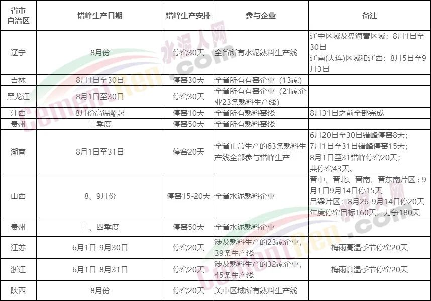 盤點(diǎn)近來(lái)發(fā)布錯(cuò)峰生產(chǎn)的省市自治區(qū),部分8-9月份處于停窯的區(qū)域時(shí)間安排如下: